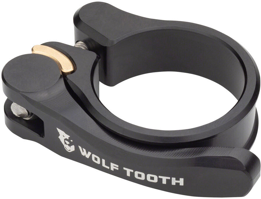 The Wolf Tooth Quick Release Seatpost Clamp allows for easy saddle height adjustments. An ergonomic lever on the side of the clamp opens and closes the clamp, which is held together by a bolt with a bronze bushing that lets the rider set the torque. It is friendly with carbon, steel, alloy, and titanium frames.